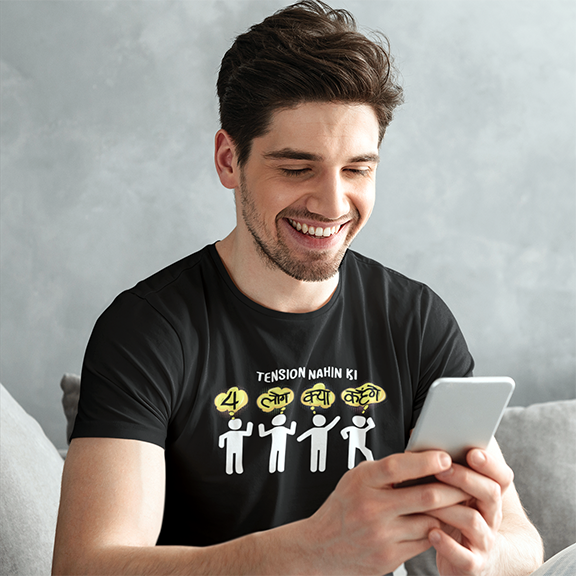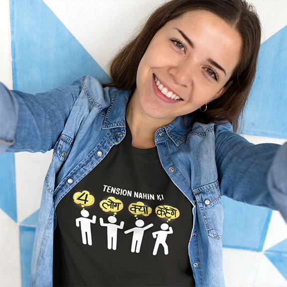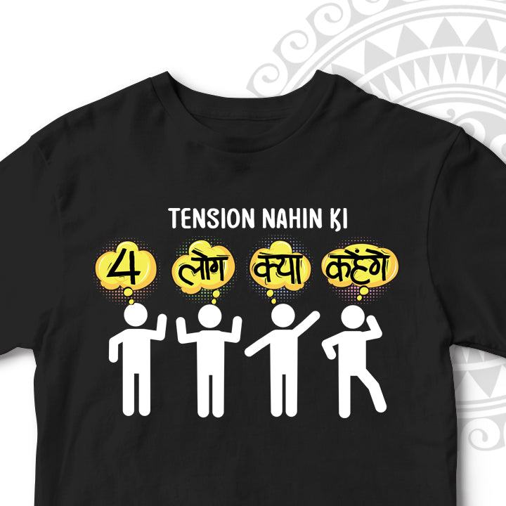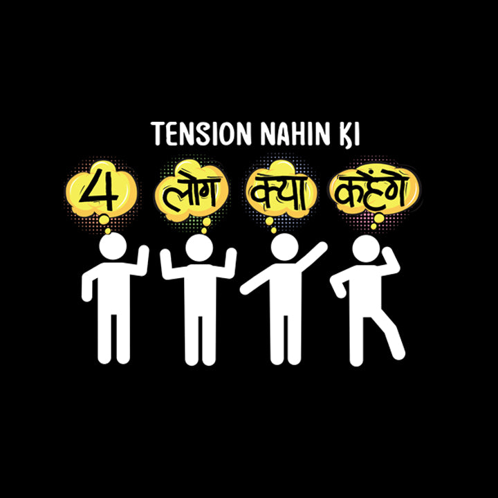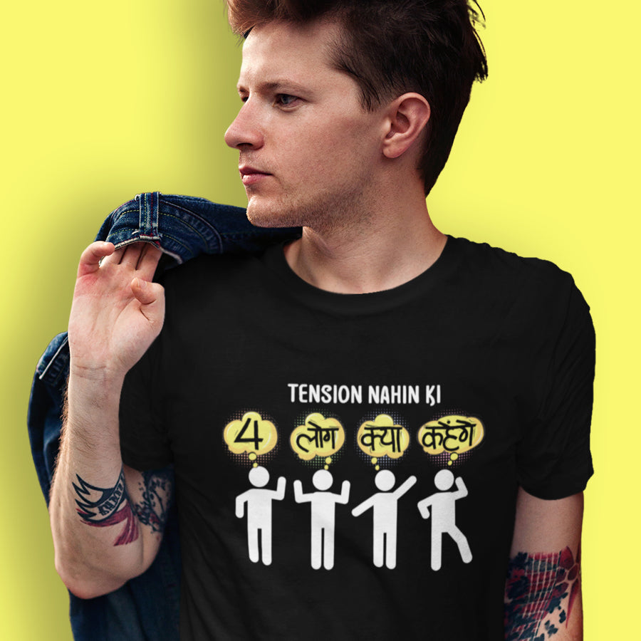 "Who cares what they think?! Show off your carefree attitude with our "4 Log Kya Kahenge" funny unisex t-shirt. Embrace the not-so-serious side of life with this quirky twist on the popular phrase. Let them judge, you've got better things to bother with!"