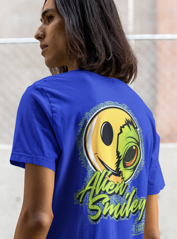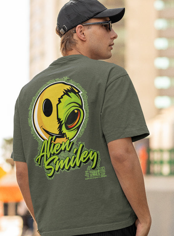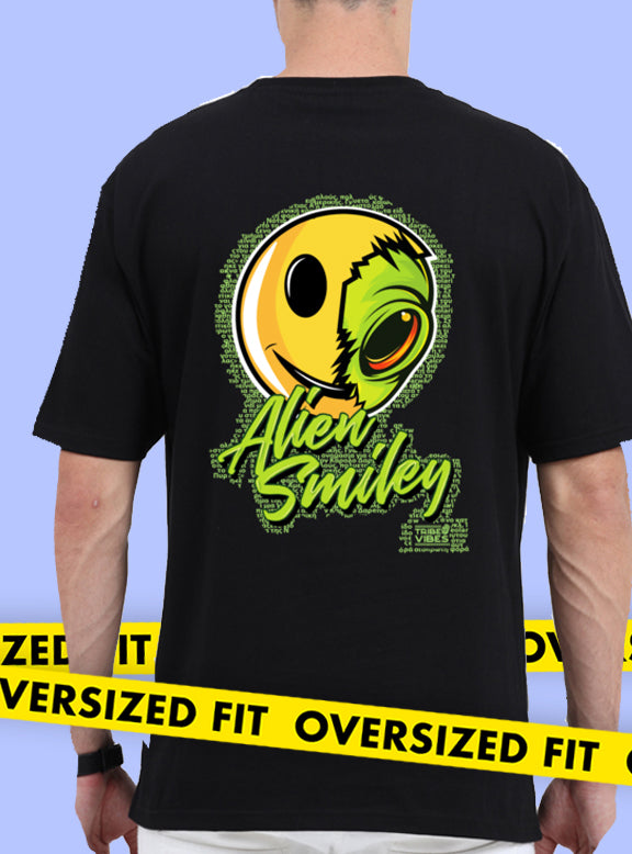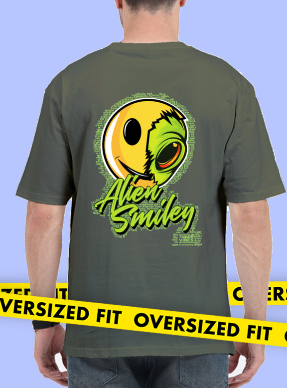 "Stand out in our oversized "Happy Alien" t-shirt, featuring a whimsical smiley face with an extraterrestrial twist. The bold, vibrant design is sure to turn heads and spark conversations. Perfect for anyone with a love for the unknown and a desire to be different."