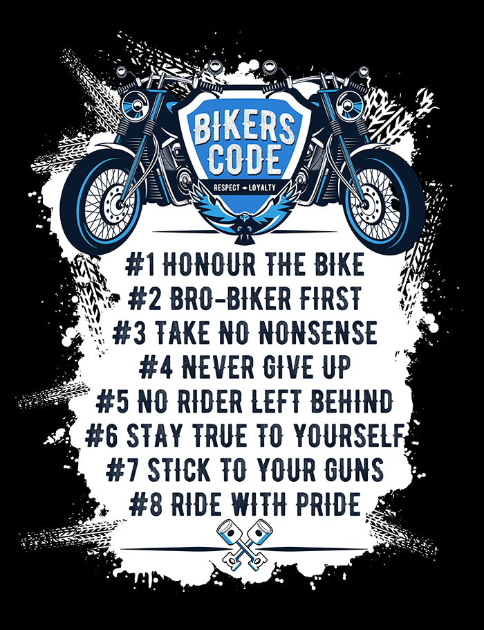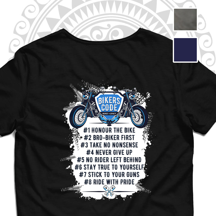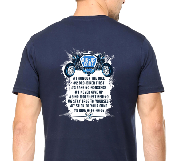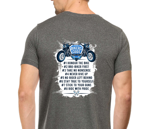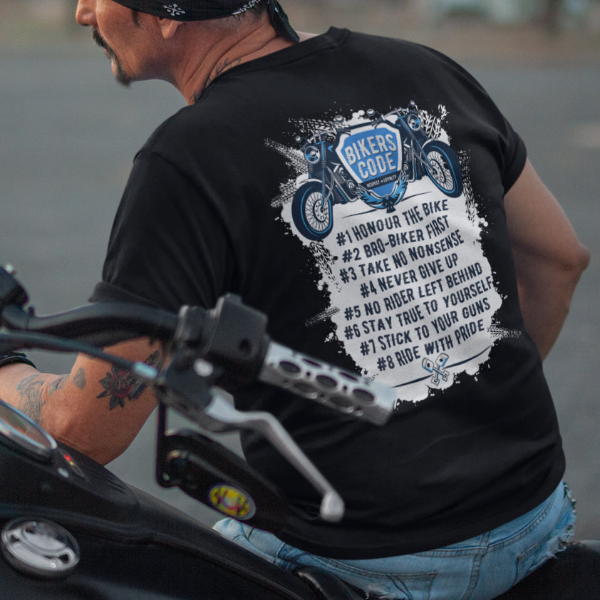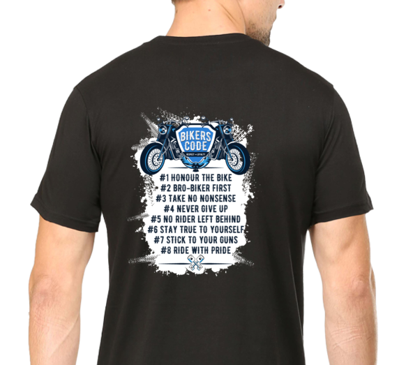 The BIKERS CODE BACKPRINT T-Shirt is perfect for bikers living by the code. Designed with BIKERS CODES on the back, this shirt is bold, stylish, and perfect for anyone who wants to make their presence known. Show off your pride and commitment to the Moto lifestyle !!