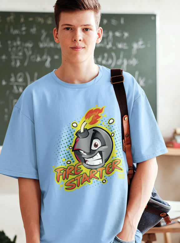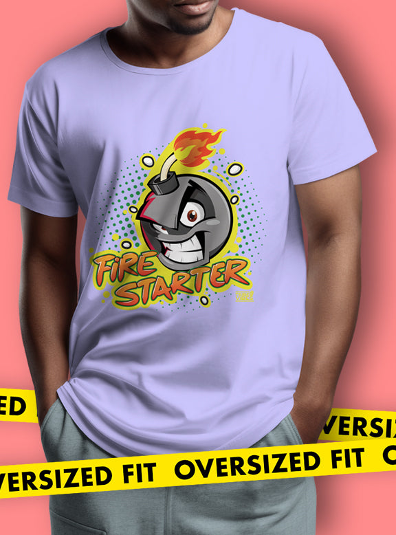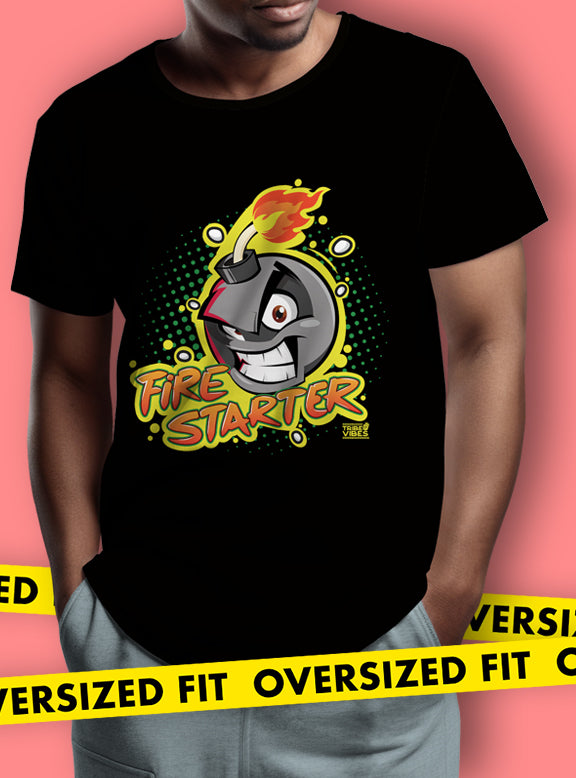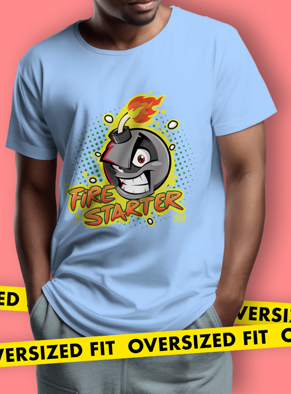 "Light up the room with this super cool "Firestarter" oversized t-shirt featuring a cool bomb-faced character - perfect for any pyromaniac with a sense of humor.