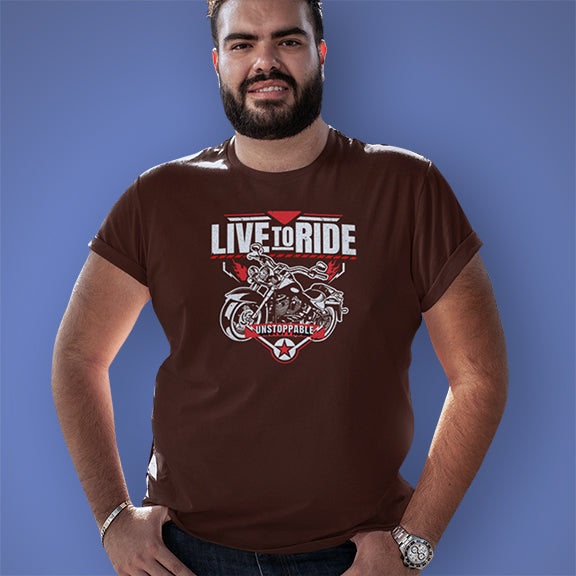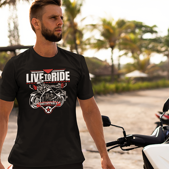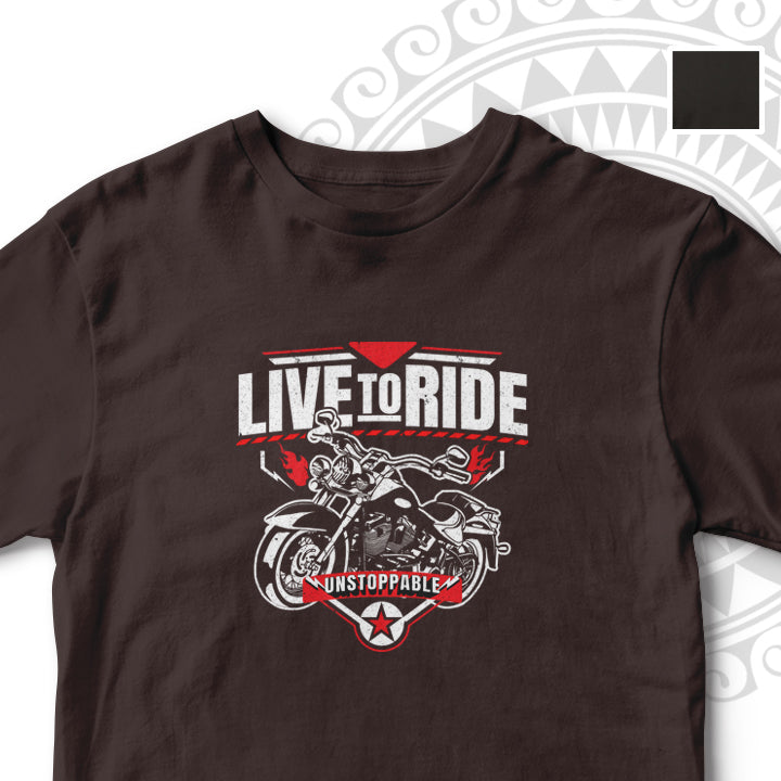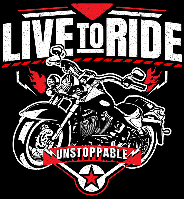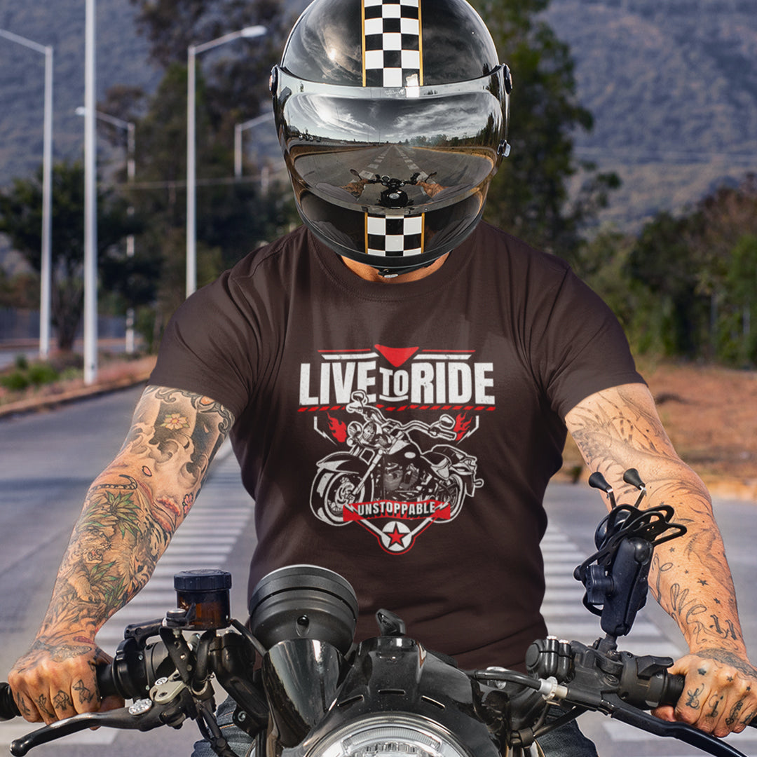 Rev up your style with our biker t-shirt featuring the iconic "Live to Ride" slogan. Made for riders who embrace the thrill of the open road, this shirt is a must-have addition to your wardrobe. Get yours today and show your passion for the ride! Available in 2 color variants