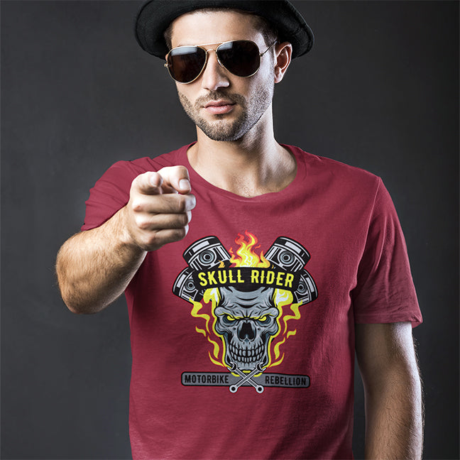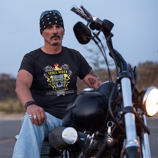 Embrace the call of the open road and the thrill of an adrenaline rush with SKULL RIDER Large Print Unisex Tshirt. Get ready to become the ultimate bike junkie on the journey of a lifetime. Unleash your inner spirit for a rip-roaring ride to remember. Let's Ride!