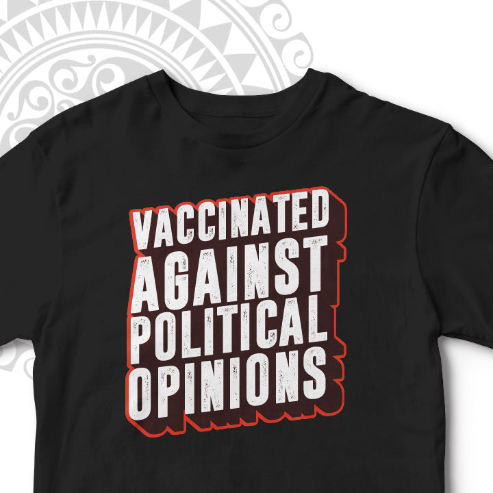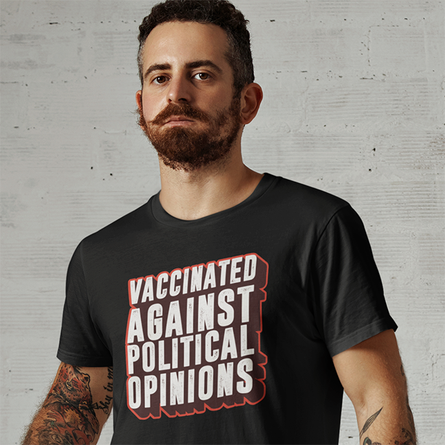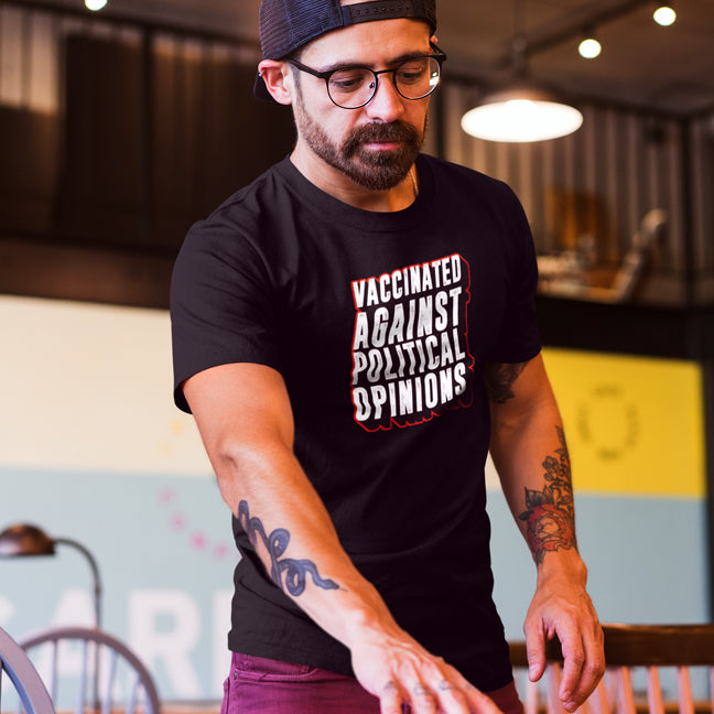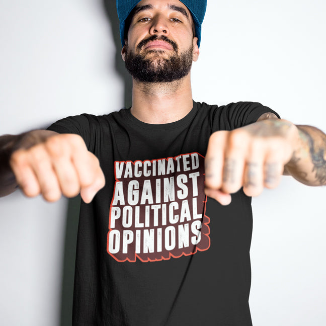 This VACCINATED AGAINST POL OPINIONS FUNNY UNISEX TSHIRT will make it crystal clear that your opinions are ones you hold dear! Don't let anyone tell you differently, 'cos you ain't gonna take no guff! Show 'em you got that immunity with a snazzy tee, it's like a vaccination - but for political opinions!